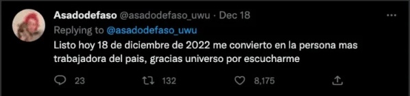 Sin embargo, finalmente la Argentina obtuvo el título de campeón del mundo, y a la joven no le quedó otra que hacerse cargo de lo que dijo: "Listo, hoy, 18 de diciembre de 2022, me convierto en la persona más trabajadora del país. Gracias universo por escucharme", tuiteó.