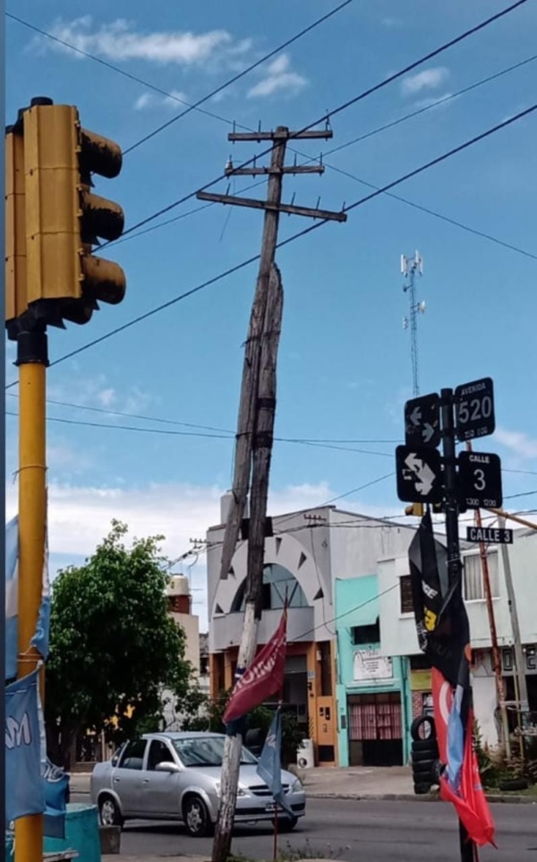 Habitantes del barrio de Ringuelet, en 3 y 520 reclaman que un poste se partió al medio, y que está siendo sostenido solo por alambres.