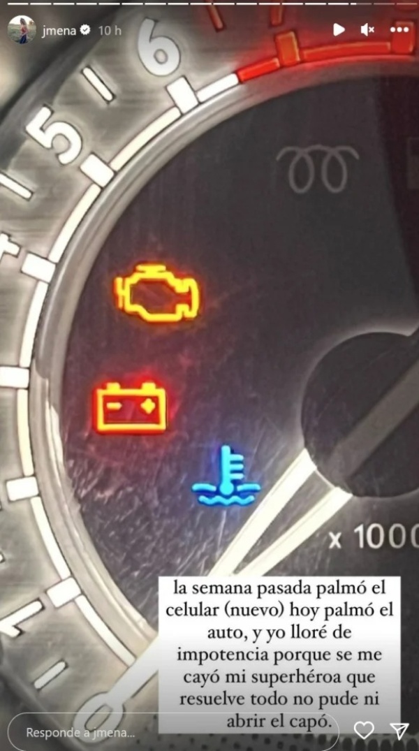 "La semana pasada palmó el celular (nuevo) y hoy palmó el auto. Y yo lloré de impotencia porque se me cayó mi superheroa que resuelve todo, no pude ni abrir el capó", contó, triste, a través de sus stories de Instagram.