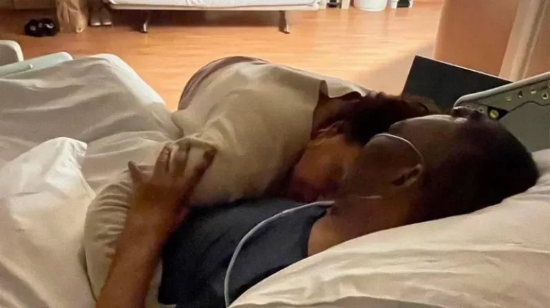 En la foto, se ve a la hija abrazada a su padre y recostada sobre su pecho en la cama del hospital de San Pablo donde el exjugador de 82 años se encuentra internado.