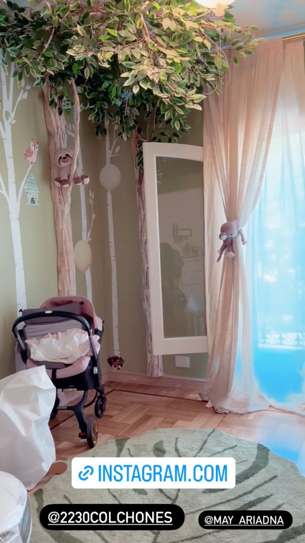 Mientras muchos apuestan por los tonos neutros o los colores pasteles, los animalitos, ositos o cosas similares, ella se la jugó y fue por el concepto 'jungla'. En uno de los rincones, se puede ver un árbol frondoso cuyas hojas continúan por la pared y se funden con la pintura, dando una sensación de que la naturaleza misma brota de las paredes.