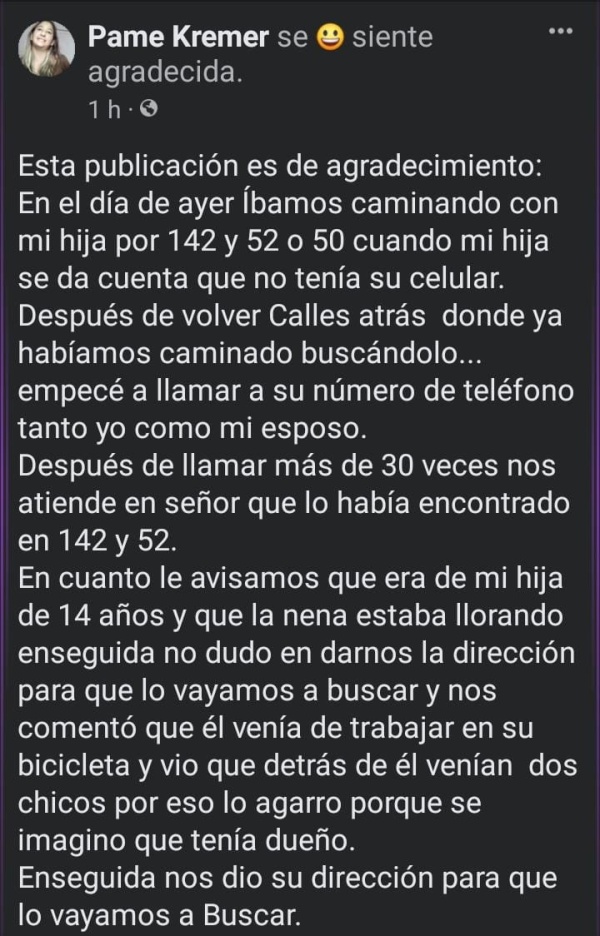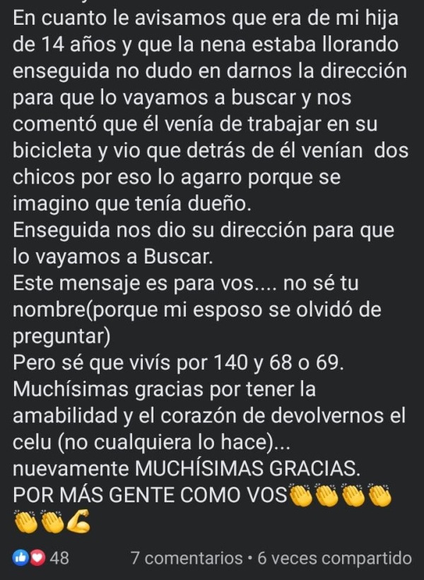 El hombre iba en bicicleta luego de trabajar, y vio un celular tirado, no dudo en agarrarlo y aguardar por ese llamado: “En cuanto le avisamos que era de mi hija de 14 años y que la nena estaba llorando enseguida no dudo en darnos la dirección para que lo vayamos a buscar y nos comentó que él venía de trabajar en su bicicleta y vio que detrás de él venían dos chicos por eso lo agarro porque se imaginó que tenía dueño”, menciona la mujer.