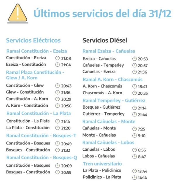 Según comunicó la empresa ferroviaria, este 31 de diciembre el servicio de pasajeros funcionará con cronograma de sábados y el 1 de diciembre con cronograma de feriados. Sin embargo, este sábado las formaciones funcionarán de manera acotada durante la noche debido a los festejos de Fin de Año.