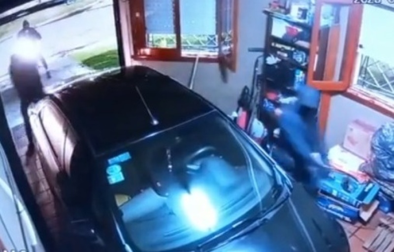 En las imágenes capturadas por una cámara de seguridad se puede ver como la victima ingresa a su vivienda para entrar una máquina de cortar pasto y los delincuentes aprovecharon este momento para meterse en la casa.