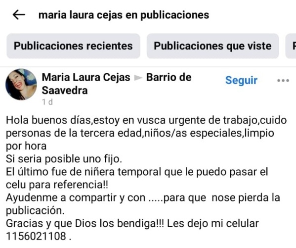 Una mujer realizó una publicación en Facebook con el motivo de búsqueda laboral. Su hermana denunció que un hombre le ofreció trabajo, la pasó a buscar y nunca más apareció.