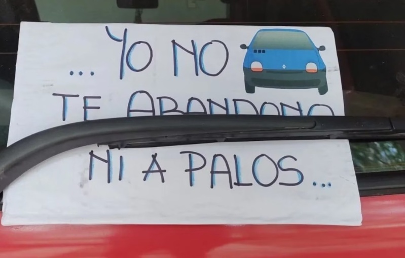 Al igual que otras mujeres dueñas del mismo auto, Sabir colocó una cartulina en la luneta de su Twingo modelo 1998 con el siguiente mensaje: “Yo no te abandono ni a palos”.