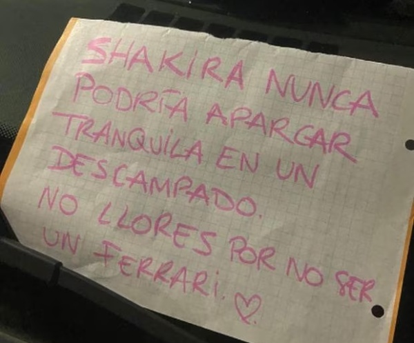 Como ya llegamos a este punto, debemos recalcar que, en total, Jesús compartió dos fotos virales en Twitter para contar todo lo que le pasó. En una de ellas, se aprecia dónde halló la singular nota y en la otra instantánea se lee lo que le pusieron: “Shakira nunca podría aparcar tranquila en un descampado. No llores por no ser un Ferrari”.