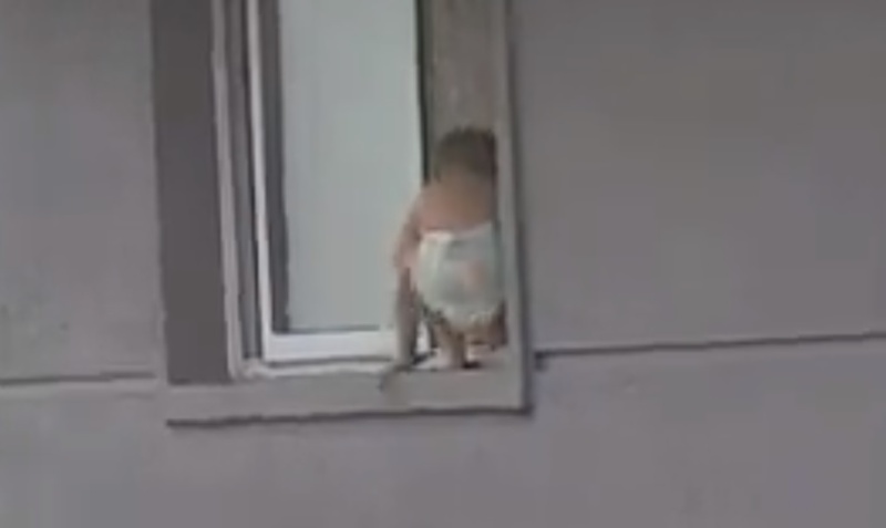 En las imágenes grabadas por un testigo que circularon en las redes sociales, se puede ver al nene parado primero en la cornisa de espaldas al vacío. De un instante al otro se arrodilla y vuelve a intentar ponerse de pie agarrado de la cortina.