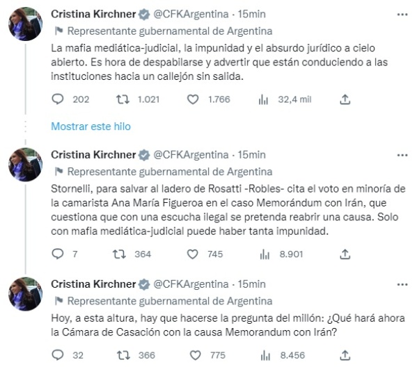 La vicepresidenta Cristina Kirchner se expresó tras el fallo del juez federal Sebastián Ramos de cerrar la causa contra el secretario del juez de la Corte Suprema de Justicia Horacio Rosatti, Silvio Robles y atribuyó la decisión a "la mafia mediática-judicial, la impunidad y el absurdo jurídico a cielo abierto".