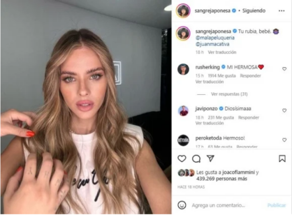 “Tu rubia, bebé”, había escrito Eugenia, mostrando su flamante imagen, a pura iluminación dejando de lado su clásico look. Su novio, el cantante de trap, celebró su nuevo look. “Mi hermosa”, escribió.