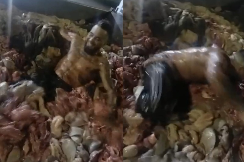 Luego de que se registraran dos muertes por achuras contaminadas, salió a la luz un video de un hombre que se sumerge en un camión lleno de tripas y carne.