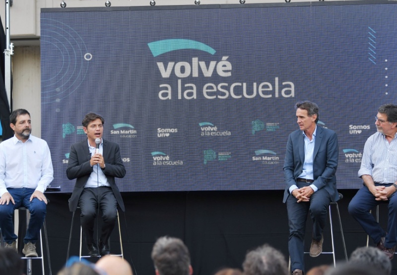 El gobernador de la provincia de Buenos Aires, Axel Kicillof, participó este lunes en San Martín de la presentación de una nueva edición del programa municipal “Volvé a la Escuela”, junto al intendente, Fernando Moreira; el ministro de Obras Públicas de la Nación, Gabriel Katopodis; y el director general de Cultura y Educación, Alberto Sileoni.