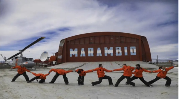 La noche del primero de febrero fue especial, a pesar de que cayó un miércoles y no día de fiesta -que exclusivamente son los sábados- el Comodoro a cargo organizó un día especial. Comenzó con los bailarines mostrando su puesta musicalizada por Gustavo Santaolalla en el hangar, en el medio de esa meseta sobre la Base Marambio que se encuentra a 210 metros del novel del mar. Los artistas con el único vestuario apto para esas temperaturas, enfrentando el viento y la dificultad de un suelo pensado para aviones, emocionaron al público que rodeó el encuentro.