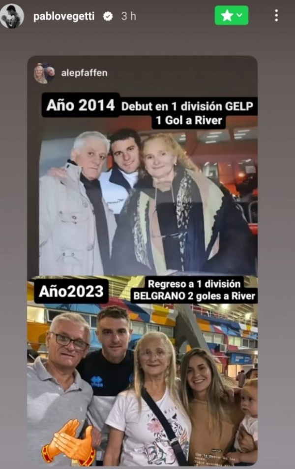 "Año 2014. Debut en Primera división GELP: 1 gol a River. Año 2023. Regreso a Primera división Belgrano. 2 goles a River", recordó al respecto, Alejandra Pfaffen, madre del jugador, en su cuenta de Instagram, con una foto de ambos momentos. Así, la familia del nacido en Santo Domingo, Santa Fe, mostró su orgullo por el peculiar récord que ostenta Vegetti: marcarle los primeros goles a Gallardo y Demichelis, en el comienzo de sus ciclos.