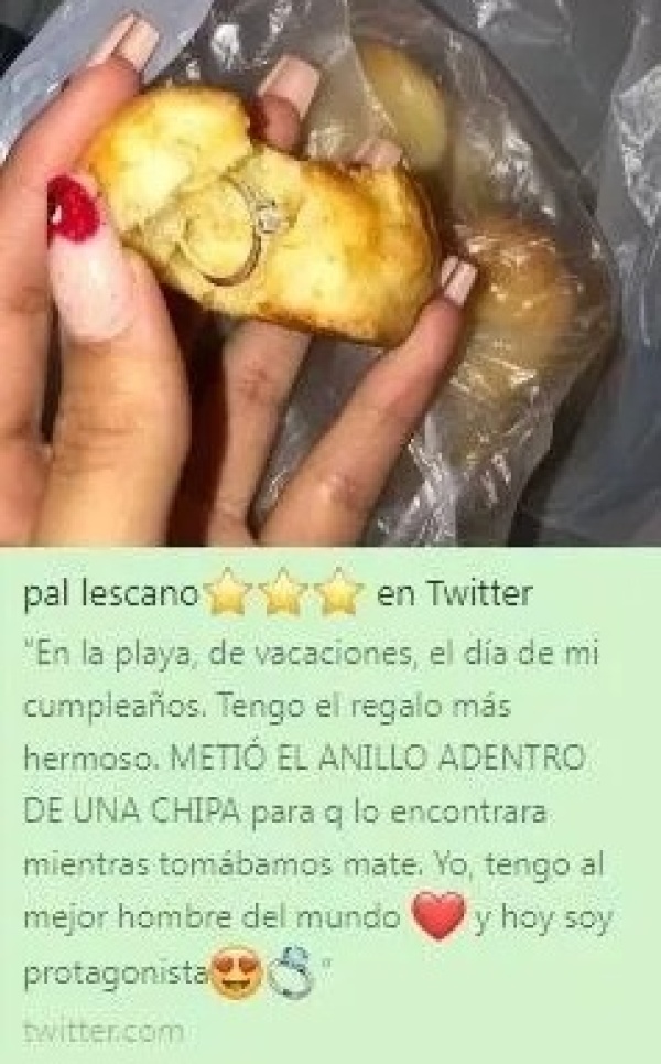 "En la playa, de vacaciones, el día de mi cumpleaños. Tengo el regalo más hermoso", indicó al comienzo de su tierno relato la joven en cuestión. Luego, reveló la sorpresa que le hizo su pareja: "Metió el anillo dentro de una chipá para que lo encontrara mientras tomábamos mate".