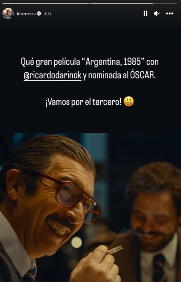 "Que gran película “Argentina, 1985” con @ricardodarinok y nominada al ÓSCAR. ¡Vamos por el tercero!”, posteó Messi en una historia de Instagram.