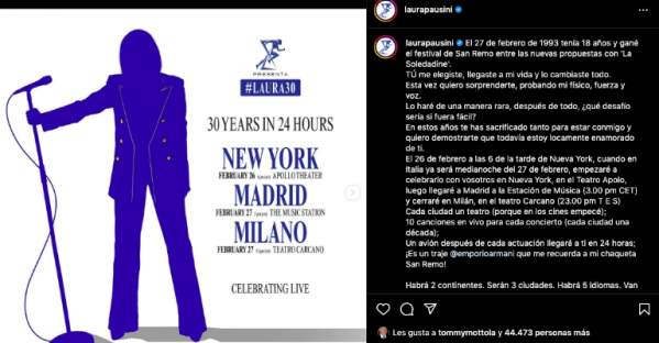 Laura Pausini tiene una de las carreras más exitosas de la industria musical y para celebrar 30 años de historia, protagonizará un evento único: tres recitales en 24 horas. El primer concierto será en Nueva York, el segundo en Madrid y cerrará con broche de oro en Milán.