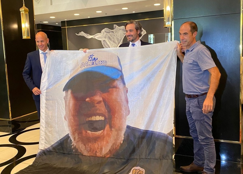 Este lunes se inauguró la nueva embajada Argentina en Bangladesh que contó con la presencia del canciller Santiago Cafiero y en el medio del protocolar acto político otra vez el Lobo estuvo presente. En ese sentido Sebastián Gubia, embajador albiazul, posó con una bandera con la figura de Diego junto al ex jefe de gabinete de Alberto Fernández.