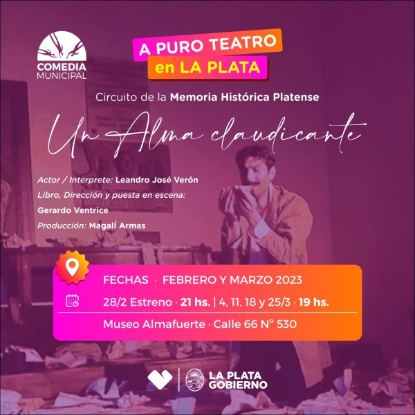 Dirigida por Gerardo Ventrice, con actuación de Leandro José Verón y producción de Magalí Armas, "Un alma claudicante" podrá disfrutarse con entrada gratuita y se recomienda al público asistir media hora antes del comienzo de la función.