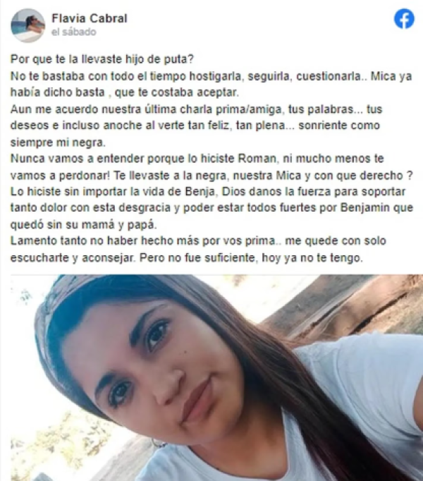 “No te bastaba con hostigarla todo el tiempo, seguirla, cuestionarla...Mica ya había dicho basta, qué te costaba aceptar (...) Nunca vamos a entender por qué lo hiciste Román, ni mucho menos te vamos a perdonar! Te llevaste a la negra, nuestra Mica y con qué derecho? Lo hiciste sin importar la vida de Benja, Dios danos la fuerza para soportar tanto dolor con esta desgracia y poder estar todos fuertes por Benjamin que quedó sin su mamá y papá”, escribió en las redes una allegada a la víctima.