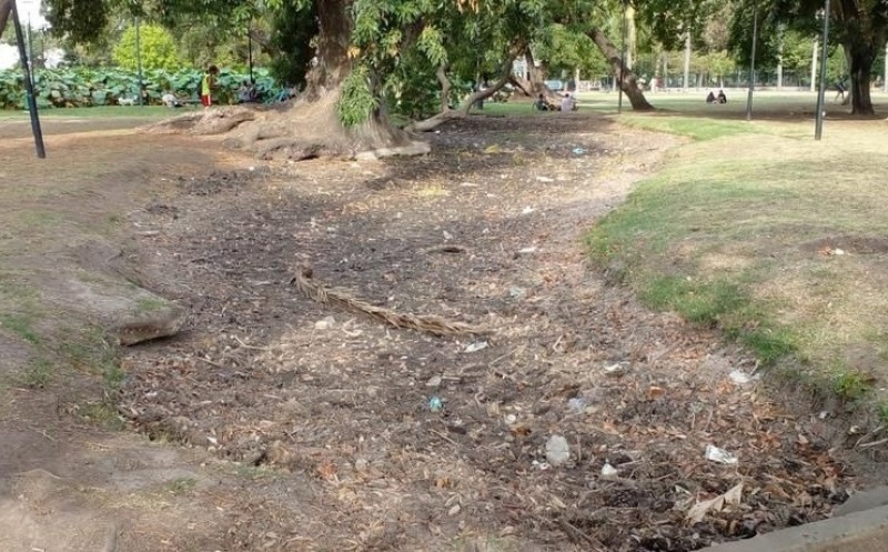 La sequía dejó ver los residuos que nadaban en el lago, admeás con los cortes de luz el chorro que está en medio del lago no funciona, eso ayuda apurificar el agua.