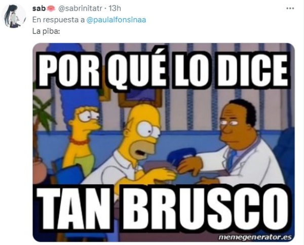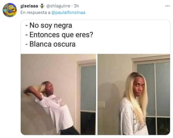 La usuaria @paulalfonsinaa escribió: “Hoy tipo 8.30 pasé caminando por la San Martín y había una parejita muy contenta sentada desayunando, pasé a comprar mi desayunito al bar y salí a esperar que me den el vaso. La mina de espaldas le dice al vago ´qué mierda la miras tanto, disimula, encima es negra”, junto a una foto-meme.