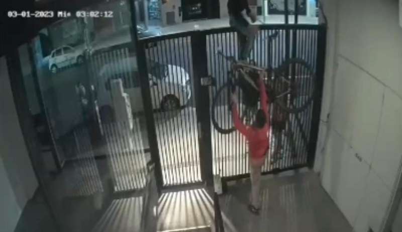 Luego, y a penas pasados unos minutos vuelven pero con una intención mayor. En el film se muestra como el malhechor de campera roja se trepa nuevamente, pero esta vez con otro que lo ayuda para finalmente abrir la reja y llevarse una moto como si nada.