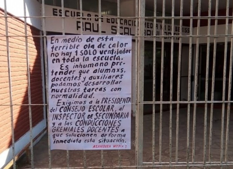 “En medio de esta terrible ola de calor no hay 1 solo ventilador en toda la escuela. Es inhumano pretender que alumnxs, docentes y auxiliares podamos desarrollar nuestras tareas con normalidad. Exigimos a la presidenta del Consejo Escolar, al Inspector de Secundaria y a las conducciones gremiales docentes a que solucionen de forma inmediata esta situación”.