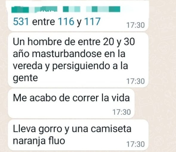 "Hay un hombre de entre 20 y 30 años masturbándose en la vereda y persiguiendo a la gente, me acabo de correr la vida", detalló la mujer.