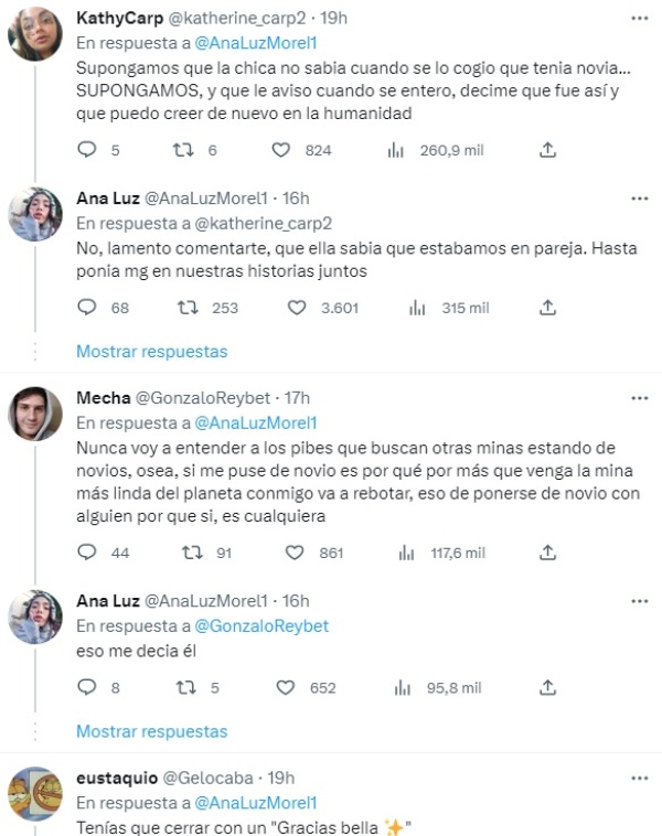 Por su parte, los demás seguidores reaccionaron: “O sea, ¿la mina sabía que estaba de novio e igual se vieron?”, “O sea que sos cornuda consciente”, “Te cuenta por las dudas”, “Hay mujeres así, les agrada hacer el papel de amanta y después te lo cuentan porque eso las hace sentir bien. Te libró, no hay dudas”.