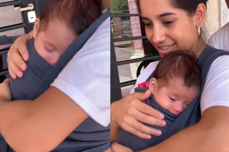 “Estaba en la facu y tenía que viajar con mi bebé para volver a casa. Mis compañeros me ayudaron a usar el fular por primera vez. Era un viaje largo e hicieron que sea más cómodo”, comenzó relatando la joven de 22 años, mientras se veía en el video como sus compañeros maniobraban para ayudarla con el bebé.