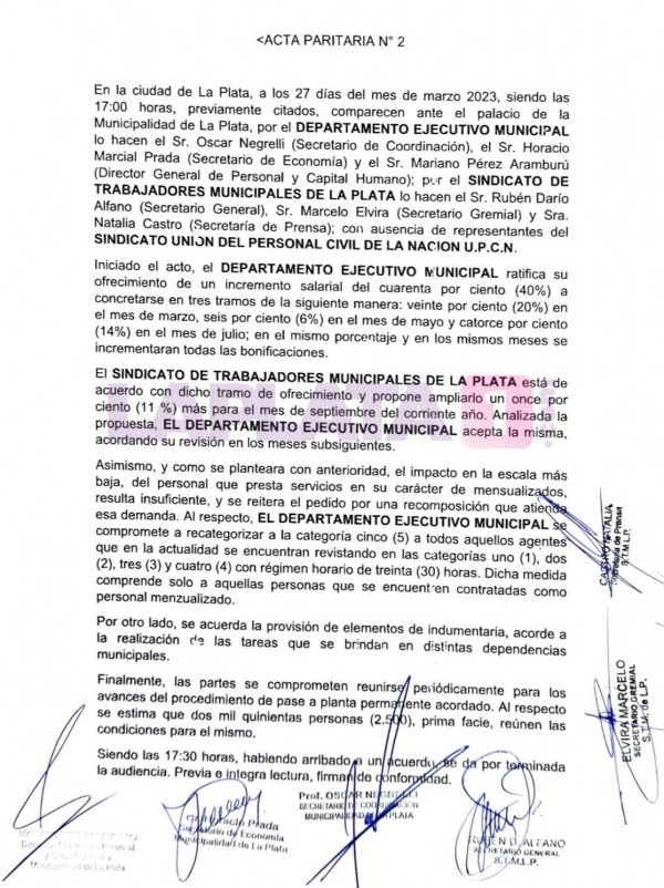 Luego de dos encuentros, favorables, esta tarde se conoció que el Intendente de La Plata, Julio Garro y el secretario del Sindicato de Trabajadores Municipales de La Plata, Darío Alfano, sellaron un acuerdo del 51% de incremento.