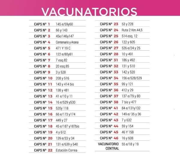 Según se informó desde el área local, todo pueden acercarse a los 46 Centros de Atención Primaria de la Salud (CAPS) de la Ciudad o al Vacunatorio Central de calle 55 entre 18 y 19 de lunes a viernes, consultar disponibilidad y aplicarse la dosis.
