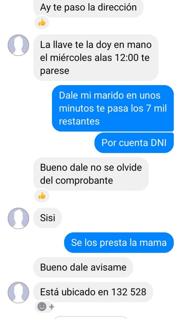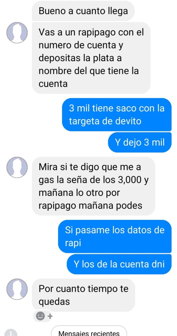 Pero ese gesto bondadoso de la supuesta vendedora rápidamente se vino abajo. Cuando Ricardo quiso coordinar el horario para finiquitar el trámite, se encontró que ella lo había bloqueado. Ya le había transferido todo el dinero: incluso 7 mil los pidió prestado.