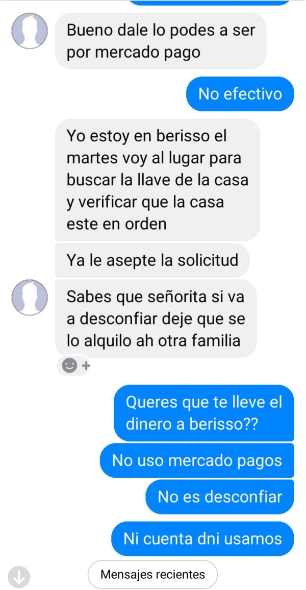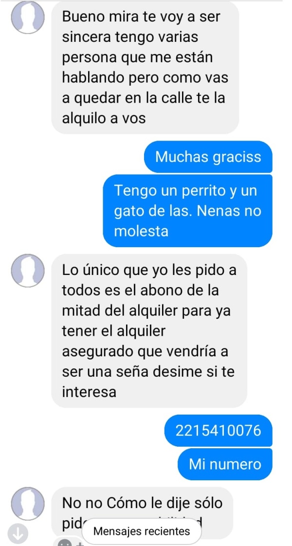 Allí se lee como la supuesta mujer le pidió una seña de 10 mil pesos. El alquiler, según afirmaba, estaba solamente a 20 mil pesos.
