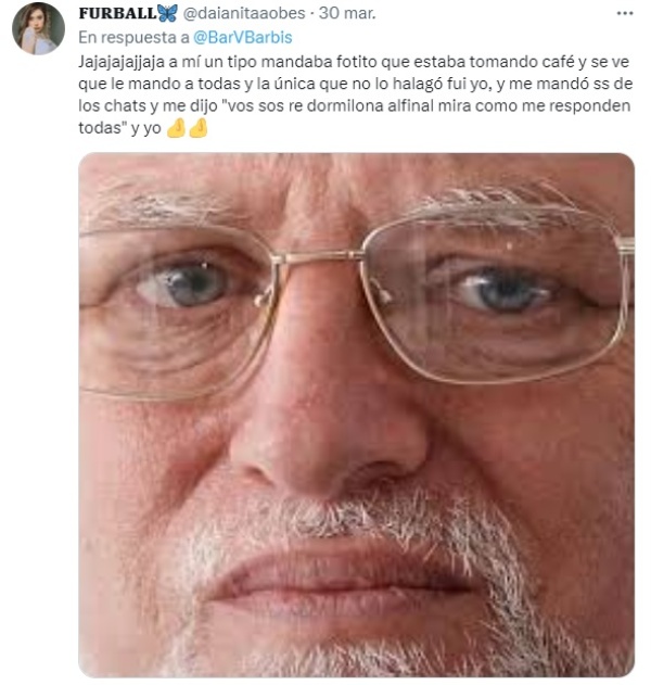 "Le dije a un pibe que no me interesaba ni hablar ni conocerlo ni nada y su brillante idea ante el rechazo fue mandarme capturas de pantalla donde le dicen que es el cogedor de america estoy tirada en piso hace media hora", escribió Bar junto a las capturas de pantallas donde se lee los halagos que recibe por sus "buenas atentidas".