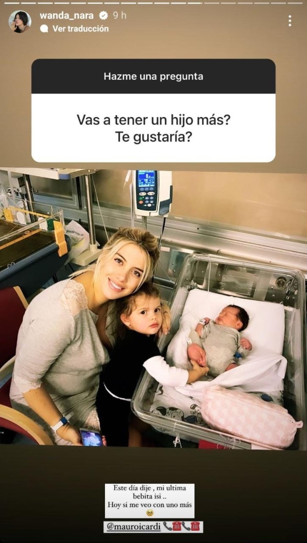 Mientras que otra fue más puntual y le preguntó sobre la posibilidad de ser mamá de nuevo. Contundente y clara como es Wanda, le respondió: “Ese día dije, mi última bebesita Isi. Hoy sí me veo con uno más”, junto a la foto de ella minutos después de haber sido mamá, acompañado de unos emojis de teléfono y la “etiqueta” a Mauro Icardi.