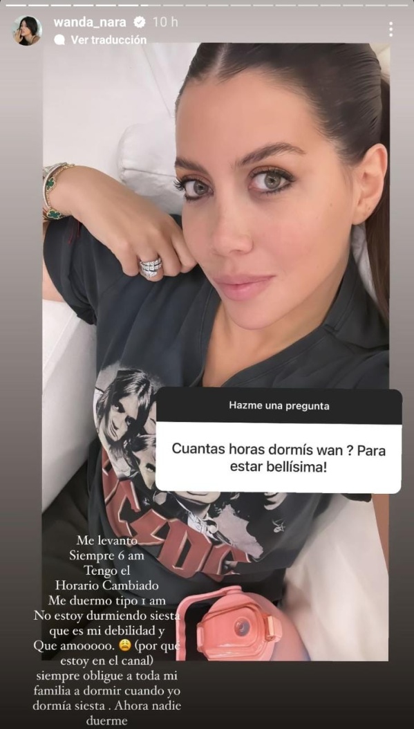 En primer lugar una usuaria le consultó sobre cuánto tiempo le dedica a su descanso: “Me levanto 6 am. Tengo el horario cambiado. Me duermo tipo una de la mañana. No estoy durmiendo siesta, que es mi debilidad y que amo (porque estoy en el canal). Siempre obligué a toda mi familia a dormir cuando yo dormía siesta. Ahora nadie duerme”.