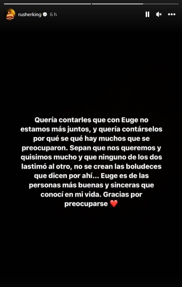 Mientras que Rusher expresó: “Quería contarles que con Euge no estamos más juntos y quería contárselos porque sé que hay muchos que se preocuparon. Sepan que nos queremos y quisimos mucho y que ninguno de los dos lastimó al otro, no se crean las boludeces que dicen por ahí…Euge es de las personas más buenas y sinceras que conocí en mi vida. Gracias por preocuparse”.