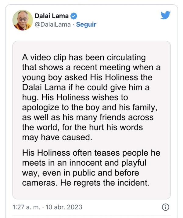 Asimismo, según indicó la prensa del líder espiritual, sostuvo que "su santidad suele bromear con la gente que conoce de forma inocente y juguetona, incluso en público y ante las cámaras". "Lamenta este incidente", manifestaron.