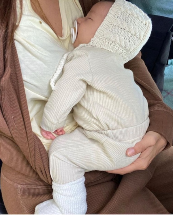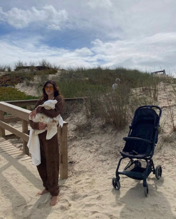 Mamá lució un enterizo marrón y una remera clarita, y sumó con su estilo único un par de gafas de sol de cristales amarillos. Por su parte, el pequeño bebé vistió un conjunto tejido beige muy tierno y sobre todo abrigado, ya que se trataba de un día nublado con un poco de viento.