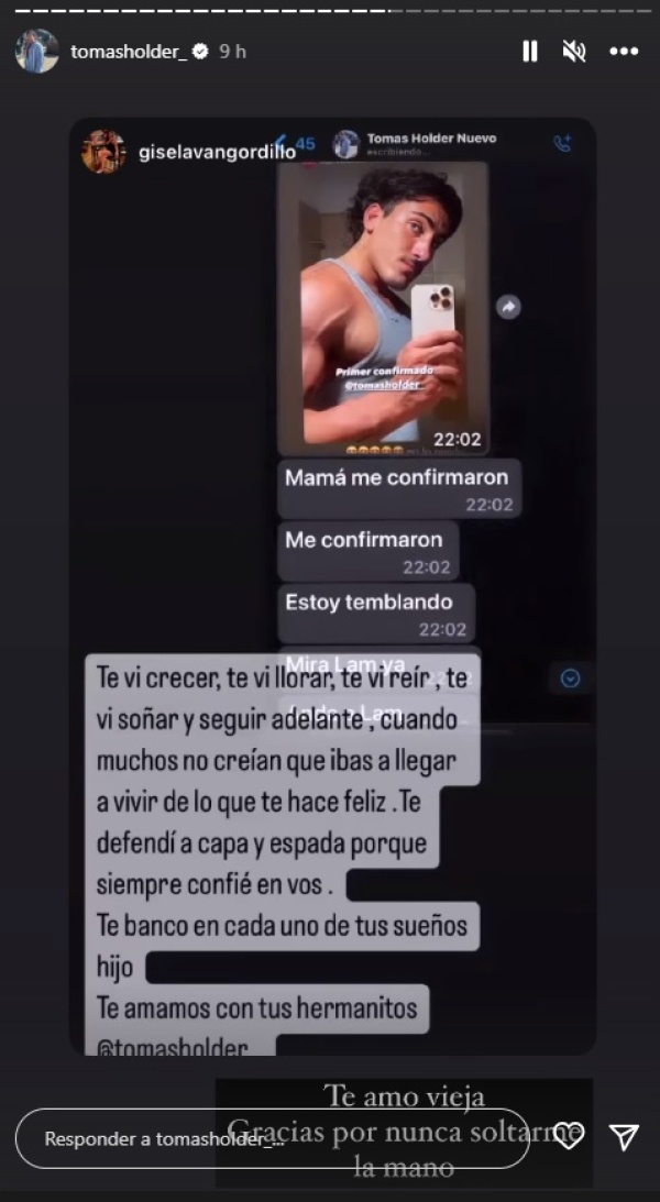 Pero no solo recibió el apoyo y cariño de amigos y seguidores sino también el conmovedor mensaje de su mamá Gisela: “Te vi crecer, te vi llorar, te vi reir, te vi soñar y seguir adelante, cuando muchos no creían que ibas a llegar a vivir de lo que te hace feliz. Te defendí a capa y escapa porque siempre confié en vos. Te banco en casa uno de tus suelos hijo”.