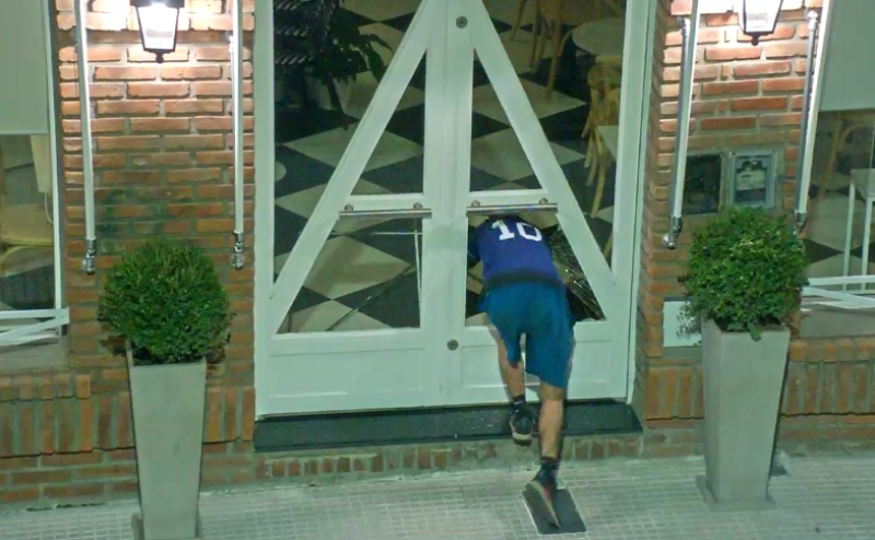 El local es una cafetería que cuenta con una puerta de vidrio, por lo que los malhechores comenzaron a propinarle patadas para poder abrirla.