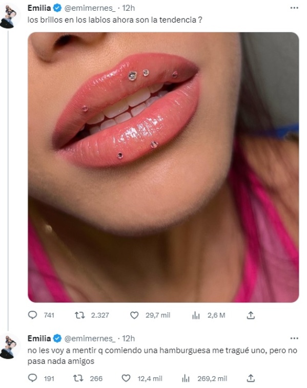 Luego del éxito de su último tema Jagger, Emilia Mernes sigue generando repercusión entre sus seguidores en cuanto al nuevo uso de los famosos “brillitos” que siempre usa la cantante.