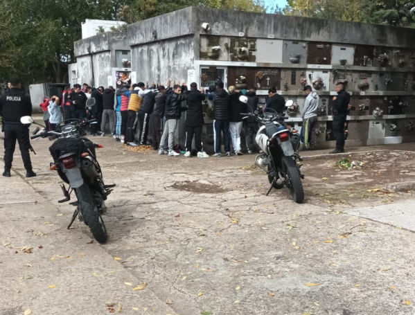 Un grupo de personas que se dirigían en caravana a bordo de motos hacia el cementerio local para celebrar el recordatorio de un fallecido, causaron disturbios en el interior del establecimiento. Durante su trayecto por la ciudad le robaron a un joven y fueron detenidos por la policía.