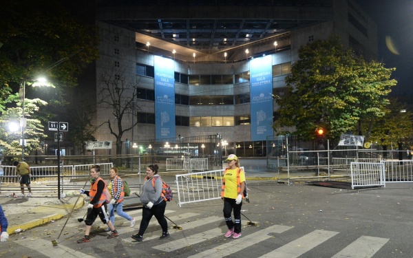 Más de 150 agentes municipales realizaron tareas de saneamiento y limpieza en el microcentro de la ciudad luego del acto de la vicepresidenta en el Teatro Argentino de La Plata.