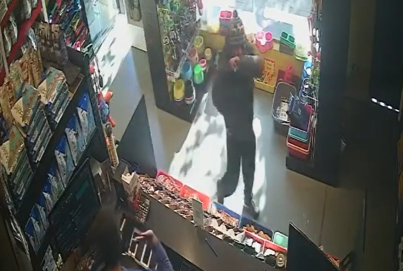 En las imágenes se puede observar como el malhechor entra y, a punta de pistola comienza a amenazar al empleado que no tuvo más que hacer que entregarle el dinero de la caja registradora.