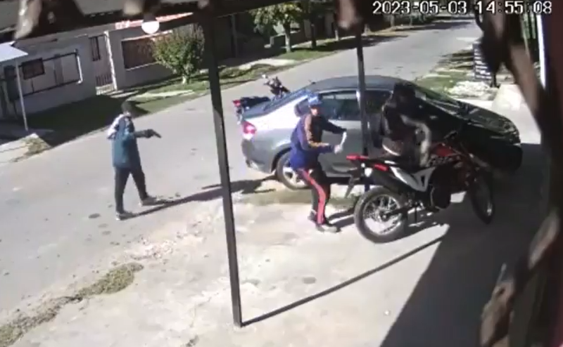 El hecho quedó grabado por las cámaras de seguridad, donde se ve cómo estos sujetos luego del tiro al hombre, apuntan con armas de fuego a una mujer al lado de su motocicleta, en la vereda de su casa.