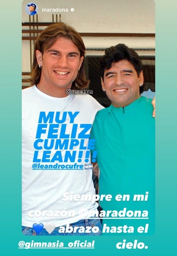 Pero las salutaciones no terminaron ahí y en esta jornada tan importante recibió una muy especial. "Muy feliz cumple Lean", publicó la cuenta oficial de Maradona, que hoy es administrada por sus hijos y recuerda distintos hechos importantes de la vida del 10. El saludo, desde ya, no pasó desapercibido para el cumpleañero y enseguida llegó el agracimiento. "Siempre en mi corazón. Abrazo hasta el cielo", le devolvió "Lea".