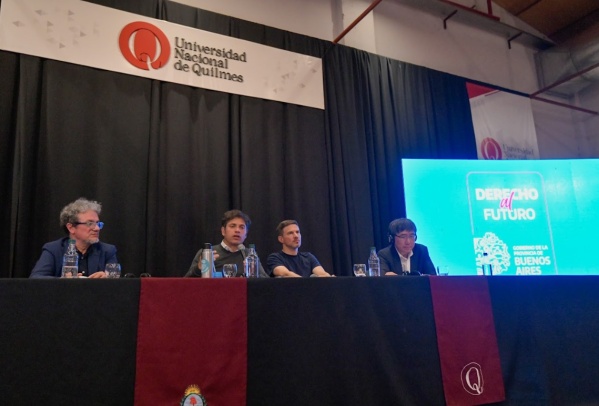 El gobernador de la Provincia de Buenos Aires, Axel Kicillof, encabezó este jueves el cierre de la jornada Derecho a la Producción en la Universidad Nacional de Quilmes (UNQ), junto al ministro de Ciencia, Producción e Innovación Tecnológica, Augusto Costa; el director del departamento de Economía y Administración de la casa de estudios, Rodolfo Pastore; y el reconocido economista surcoreano Ha-Joon Chang.